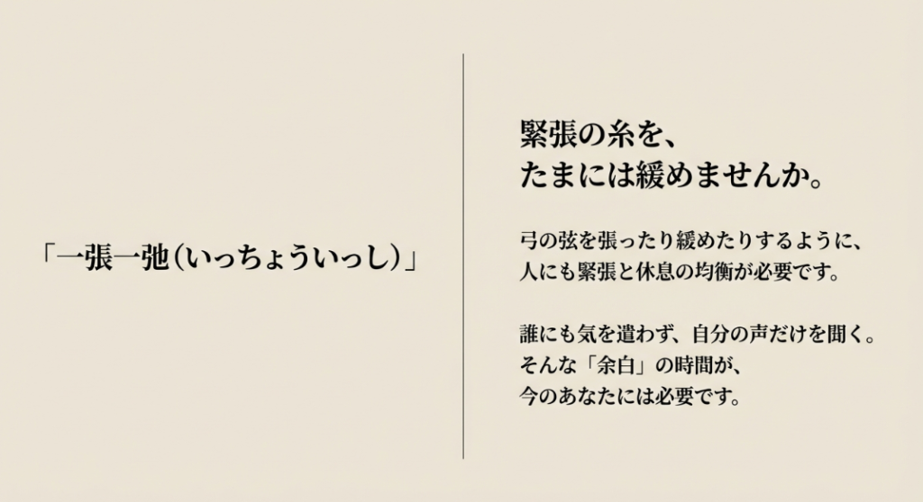 かつて水戸藩主だった徳川斉昭が偕楽園を造った際、「一張一弛(いっちょういっし)」という教えを込めたと言われています。これは、弓の弦をピンと張ったり緩めたりするように、人間にも緊張とリラックスのバランスが絶対に必要だという思想です。毎日一生懸命に働き、人間関係や情報過多な社会の中で気を張って(緊張して)生きている私たち現代人だからこそ、時には一人になって、そのピンと張った心の糸を思い切り緩める(リラックスする)ための「余白」の時間が必要不可欠なんだと強く感じます。