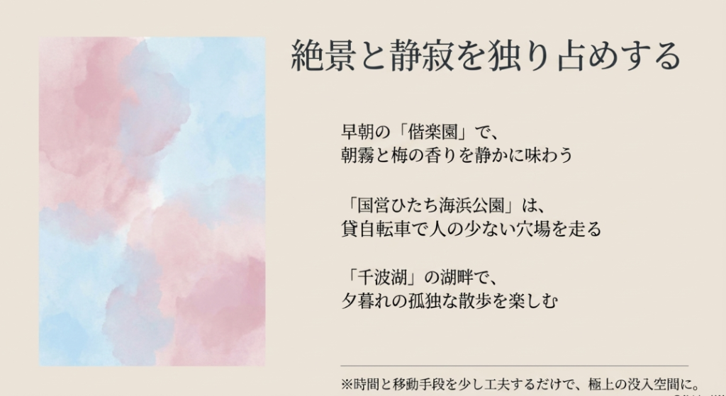 忙しい毎日から離れて「ゆっくり」とした時間を過ごすには、自然の景色に身を委ねるのが一番かなと思います。茨城県には、そんな気分にぴったりの名所がいくつもありますが、特におすすめしたいのが水戸市にある日本三名園の一つ「偕楽園」です。ここは江戸時代に徳川斉昭によって造られた歴史ある庭園で、広大な敷地に約3,000本もの梅が咲き誇る景観は本当に圧巻です。でも、1人旅で私が強くおすすめしたいのは、観光客で賑わう日中を避けた早朝の散策なんですね。朝の清々しい空気の中、朝露に濡れた梅の木々や静寂に包まれた庭園を独り占めできる感覚は、1人旅ならではの極上の贅沢です。