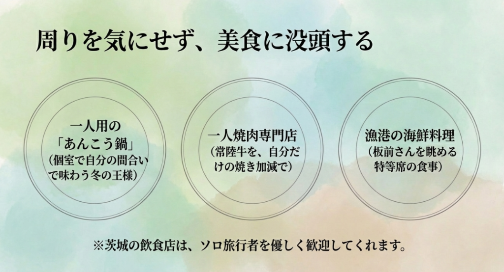 海鮮が好きな方なら、那珂湊おさかな市場や大洗周辺の海鮮料理店も外せません。カウンター席が用意されているお店を選べば、板前さんの手捌きを眺めながら、新鮮な地魚の海鮮丼や握り寿司を気兼ねなくいただけます。ご当地グルメを「自分だけのパーソナルな体験」として消費できる環境が整っているのは、茨城県がソロトラベラーにとって非常に旅しやすい理由の一つかなと思います。