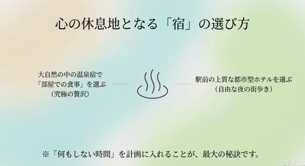 行きたい場所のイメージが湧いてきたら、次は旅の拠点となる宿やルートの詳細な計画ですね。1人旅を成功させる最大のコツは、予定をギュウギュウに詰め込まず、「何もしない時間」という余白をあえて作ることです。ここでは、おひとり様を歓迎してくれる温泉宿や、マイペースに回れる移動手段別のモデルコースを徹底的にまとめてみました。