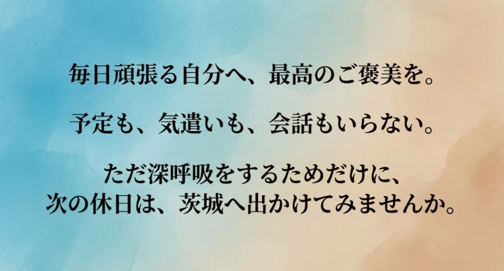 誰かの予定に合わせる必要も、気を遣って会話をする必要もありません。自分の心の声にだけ耳を傾け、体が喜ぶ美味しいものを食べ、美しい景色を見てただ深呼吸をする。そんな最高の「リトリート」を叶えてくれる場所が、都心からすぐ近くの茨城県にたくさん待っています。日帰りでも、思い切って2泊3日でも構いません。毎日頑張っている自分自身への最高のご褒美として、ぜひ次の休日は、茨城県への1人ゆっくり旅へふらっと出かけてみてはいかがでしょうか。この記事が、あなたの心と体を優しくほどく、素敵な休日づくりの参考になれば心から嬉しいです!