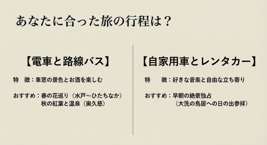 車の運転が苦にならない、むしろ好きだという方にとって、密室である車内は「動くプライベートルーム」です。自分の好きな音楽やラジオを少し大きめのボリュームで流し、誰とも話さずに目的地へ向かうドライブ旅は、広大な平野部や美しい海岸線を持つ茨城県と非常に相性が良いんです。時間に縛られず、気になる景色があればふらっと立ち寄れる自由度の高さは、レンタカー旅ならではの最大の強みですよね。