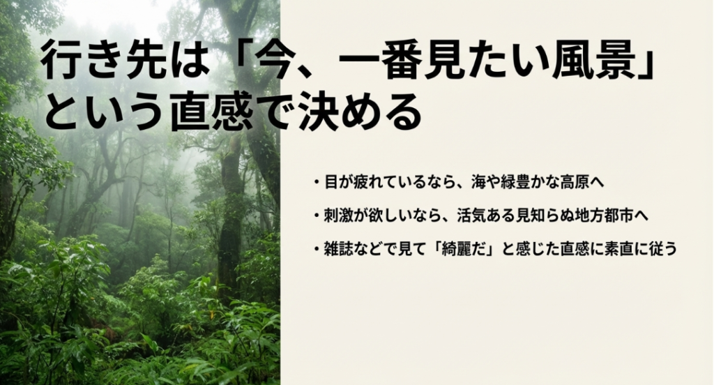たとえば、パソコンやスマホの画面ばかり見ていて目が疲れているなら、視界いっぱいに広がる青い海が見える静かな港町や、深呼吸したくなるような緑豊かな高原がおすすめです。自然の音に耳を傾けるだけで、驚くほど心が落ち着いていくのを感じられるはずですよ。