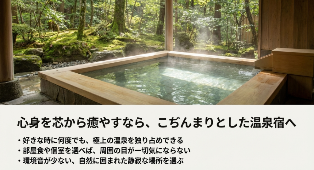 とにかく静かに過ごして心を休めたい時は、団体客が多い大型の温泉街やリゾートホテルよりも、客室数が少なめでこぢんまりとした隠れ家的な温泉宿をおすすめします。また、山奥や海辺など、自然に囲まれた静寂な環境にある温泉地を選ぶと、環境音が少なく、より深くリラックスできるかなと思います。