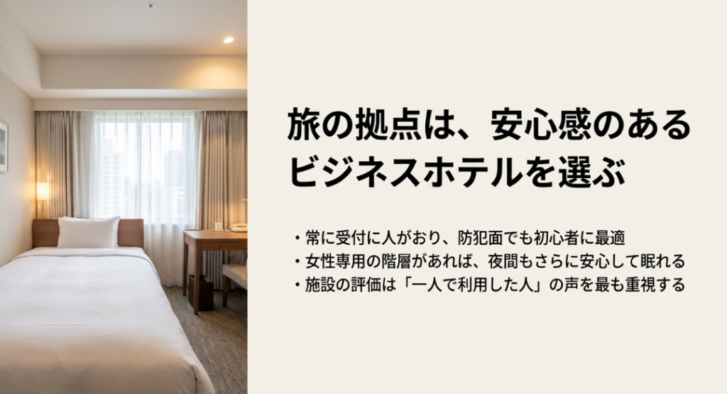 一人旅に慣れていないうちは、セキュリティがしっかりしていてフロントに常に人がいるビジネスホテルを選ぶのが一番安心かなと思います。女性の一人旅であれば、カードキーでしか入れない女性専用フロアが設けられているホテルを選ぶと、夜間も不安なくぐっすり眠ることができます。自分の今回の旅の目的や予算にぴったり合わせて、心からリラックスできる居心地の良い拠点を見つけてみてくださいね。