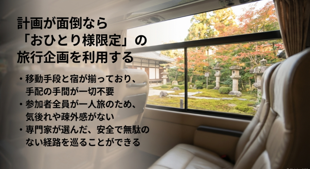 これらのツアーを利用する最大のメリットは、何と言っても手配の煩わしさから完全に解放されることです。新幹線や飛行機などの移動手段と、一人でも安心して泊まれる宿泊先が最初からセットになっているため、あなたは出発日を決めて申し込むだけで準備が完了します。現地での交通アクセスが不便な秘境や絶景スポットであっても、ツアー専用のバスで効率よく連れて行ってもらえるので、移動ルートを調べて迷うストレスがありません。
