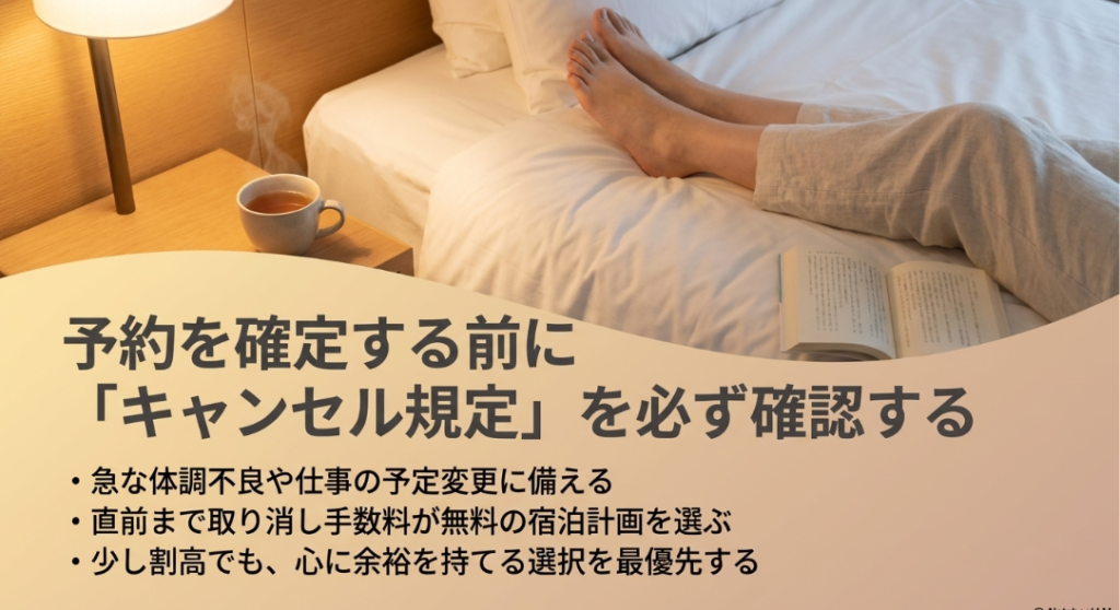 少し割高になっても、前日までキャンセル料が無料になるプランを選んでおいた方が、特に一人旅の場合は心の余裕に繋がります。最終的な判断はご自身のスケジュールと照らし合わせて、最もリスクの少ない予約方法を選んでくださいね。