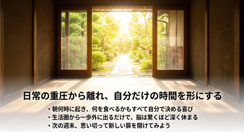 週末だけのたった1泊2日、あるいは日帰りの短い時間であったとしても、日常の生活圏から一歩外に出て違う空気を吸うだけで、脳はしっかりとリフレッシュされます。「せっかくの休みだから家でゴロゴロして体力を温存しよう」と思う日もあるかもしれませんが、あえて少しだけ外に出た方が、かえって精神的な疲労がスッキリと取れて、日曜日の夜には驚くほど気分が晴れやかになっていることが多いんです。次の週末、予定がぽっかり空いているなら、思い切って近場のリフレッシュスポットへ足を運んでみてはいかがでしょうか。