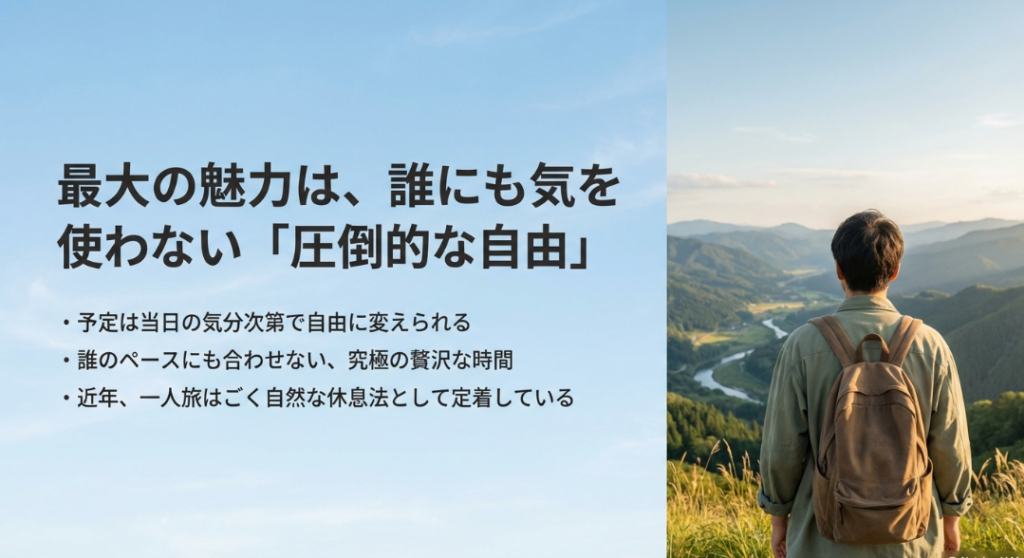 1人旅行の最大の醍醐味は、何と言ってもその圧倒的な自由度にあります。誰かのスケジュールに合わせる必要がなく、その日の気分で予定をふらっと変えられるのは、本当に贅沢な時間の使い方ですね。実際、近年はグループ旅行よりも単独での旅行を選ぶ方が増えており、(出典:観光庁『令和7年版観光白書(概要版)』)のデータでも、友人との旅行が減少傾向にある一方で一人旅が着実に増加傾向にあることが示されています。今や一人旅はごく自然なリフレッシュの手段として社会に定着していると言えますね。この章では、そんな一人旅の魅力をたっぷり味わうための目的地の選び方や、初心者の方にもおすすめのプランをご紹介していきますね。